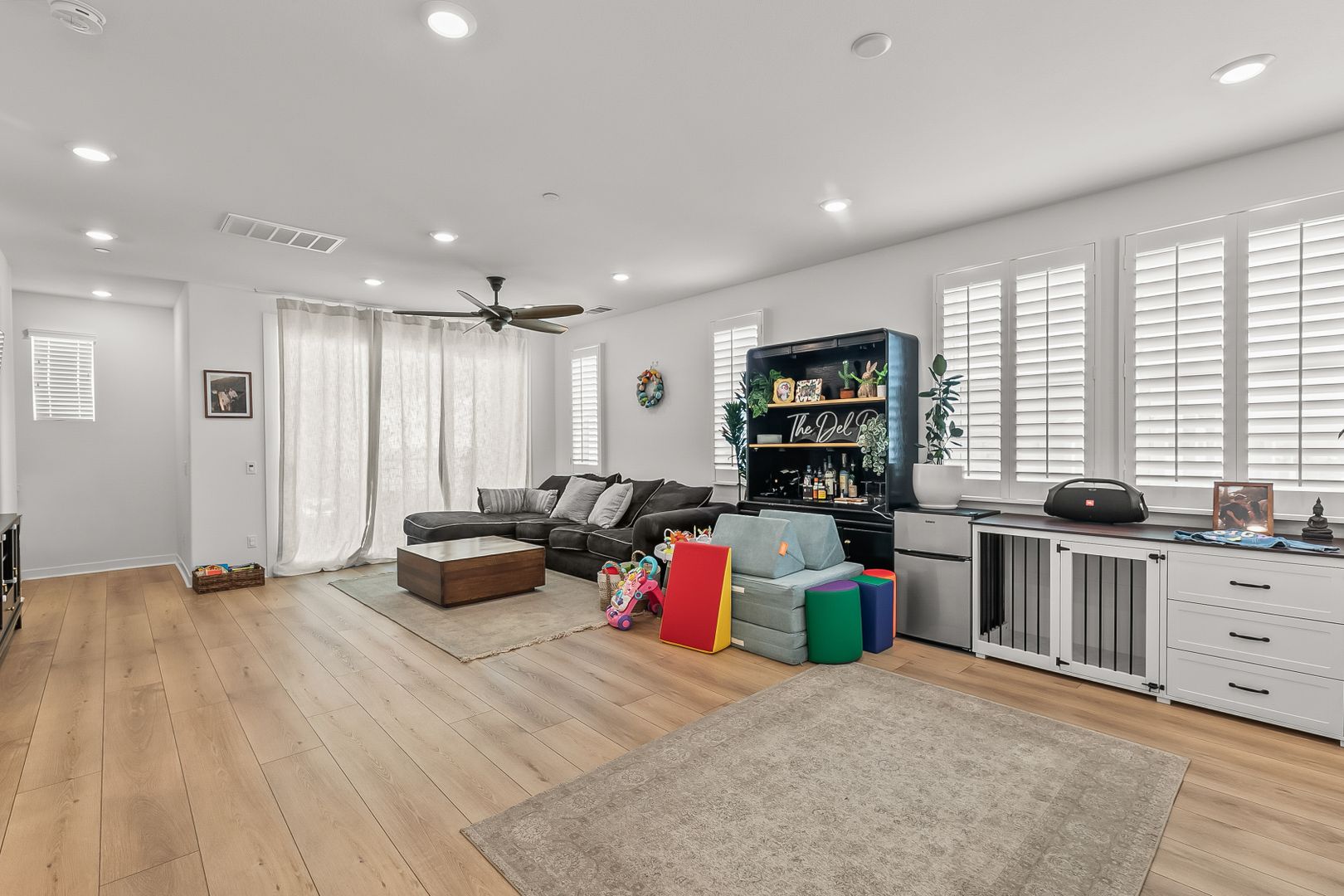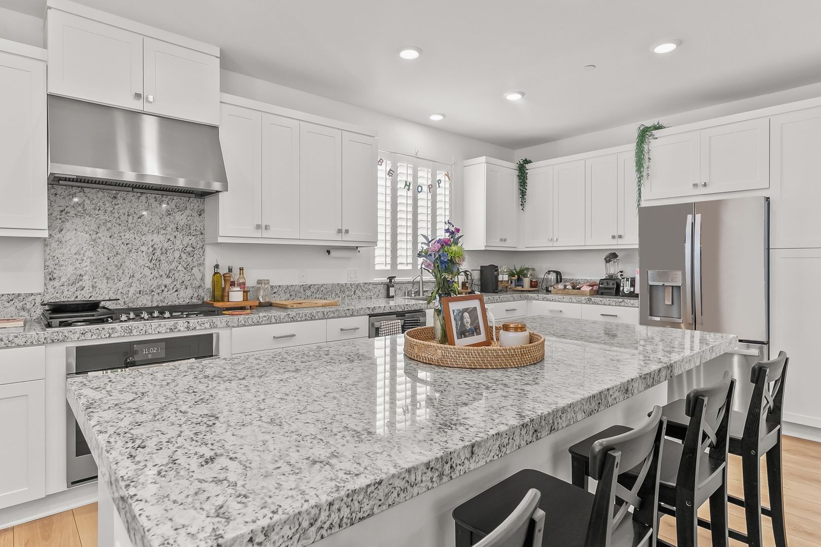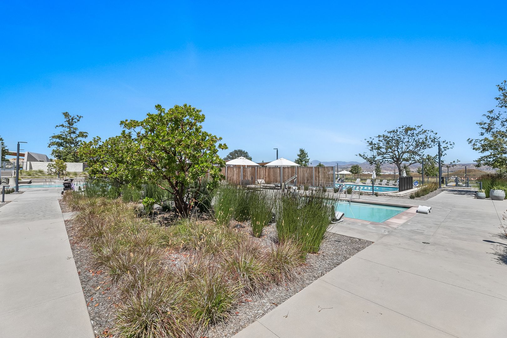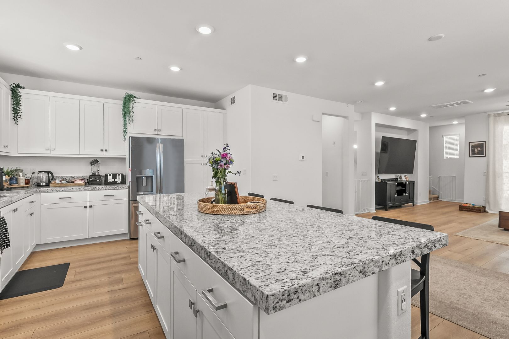 Welcome to this exquisite modern townhome nestled in the Tulip Community by Lennar, situated in the vibrant Valencia Five Point neighborhood! Step into this newer construction three-story townhome that boasts contemporary elegance and a turnkey condition. With attention to detail and numerous upgrades, this residence features 3 bedrooms and 3.5 half bathrooms. As you enter, you'll discover a spacious family room complemented by an expansive outdoor balcony, providing the perfect setting for relaxation, socializing with friends, and enjoying the spectacular fireworks display at Magic Mountain during the holidays. This sought-after floor plan offers a versatile downstairs bedroom with an en-suite bath, ideal for multi-generational living, accommodating in-laws, or serving as a private office. The high ceilings and ample closet space add to the room's appeal. Ascending the first flight of stairs, you'll be greeted by a generously sized great room, perfect for hosting gatherings and entertaining guests. The impressive kitchen is a true highlight, featuring a striking center island, a walk-in pantry, under-cabinet lighting, Quartz countertops, Whirlpool stainless steel appliances, and sleek, soft-close drawers and cabinets. The next flight of stairs leads you to two additional spacious bedrooms, one of those being the luxurious primary suite. Here, you'll find a walk-in closet, a dual sink vanity, and a beautifully tiled shower. The modern finishes and sleek design elements throughout the home create an inviting atmosphere, inviting its new owner to take pride in their ownership. This townhome also offers convenient amenities such as direct access to a rear-facing two-car garage with EV car charger and ample storage space. The home is ENERGY STAR® certified, featuring leased solar, a tankless water heater, a smart thermostat, and a smart garage system. Embrace the lifestyle offered by the state-of-the-art Five Points Valencia planned community, which provides residents with world-class parks, scenic walkways, a community center, refreshing pool, and engaging playground. Additionally, proposed potential future plans include a library, an elementary school, parks, and greenbelts. Don't miss your opportunity to own this stunning, move-in-ready townhome that seamlessly blends modern sophistication with convenience and comfort. This will undoubtedly be a great place to call HOME!